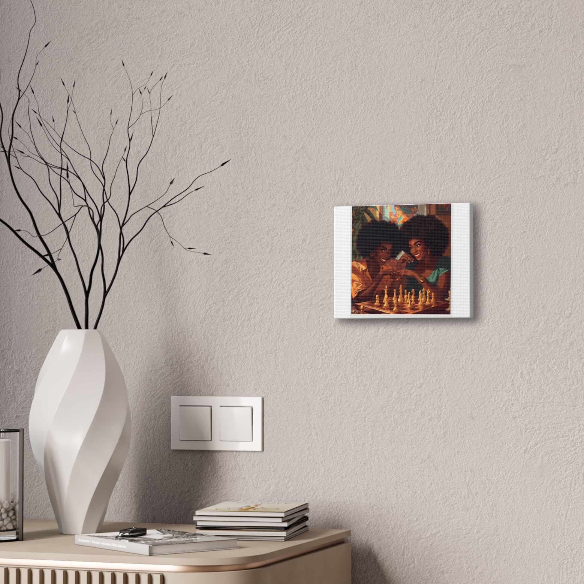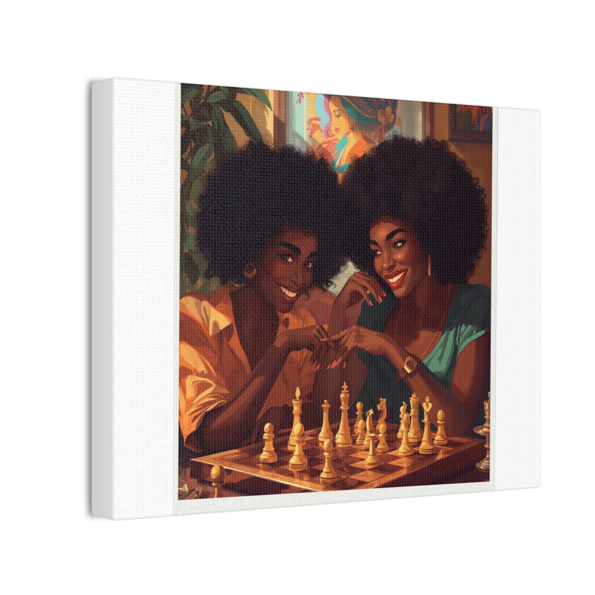 Beautiful canvas art featuring sisters playing chess. Celebrate Black sisterhood, intelligence and strategic thinking. Premium quality wall art.