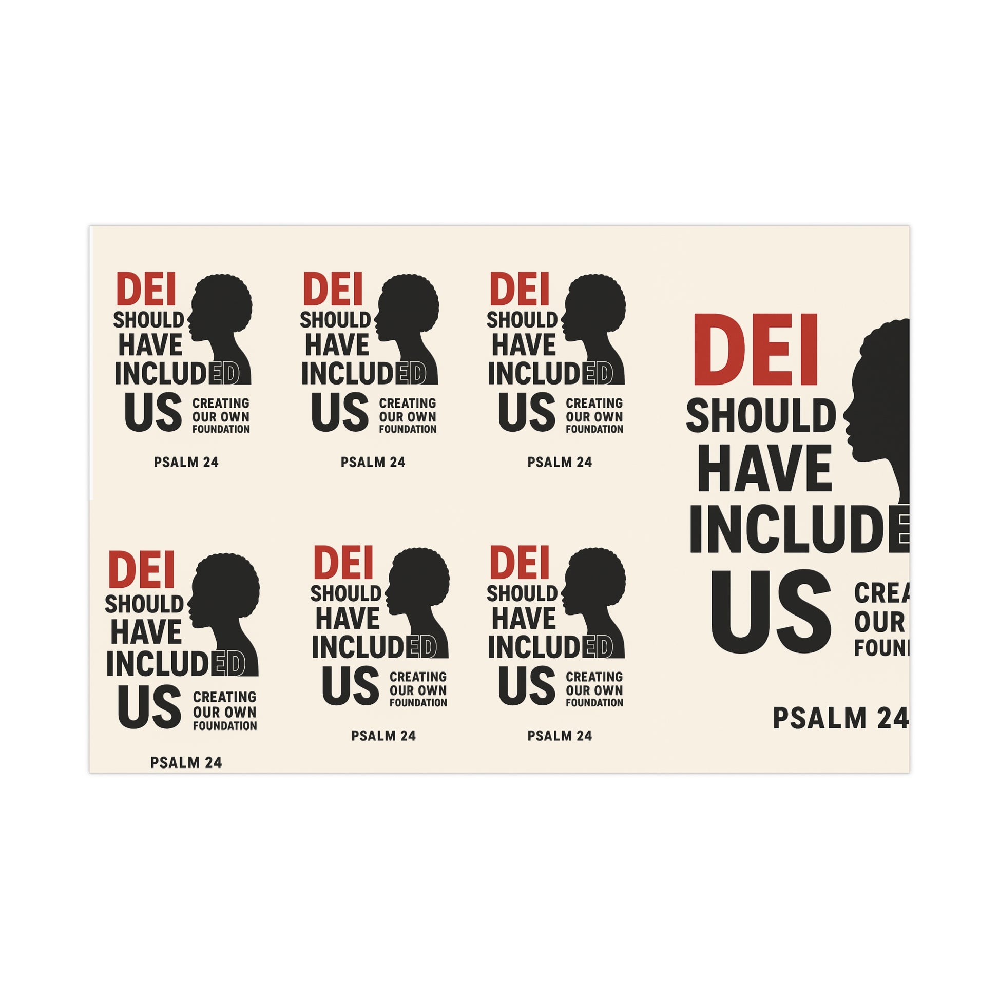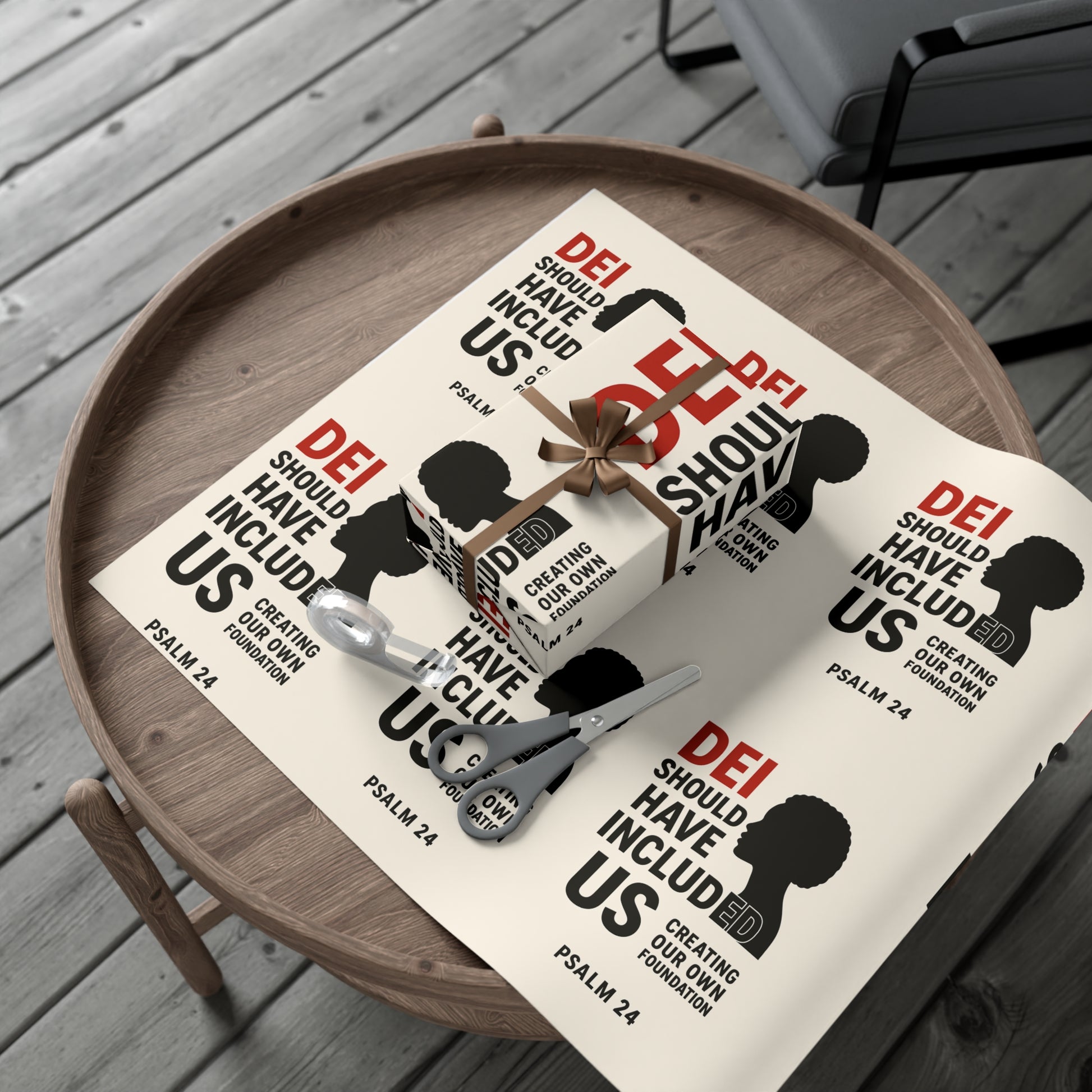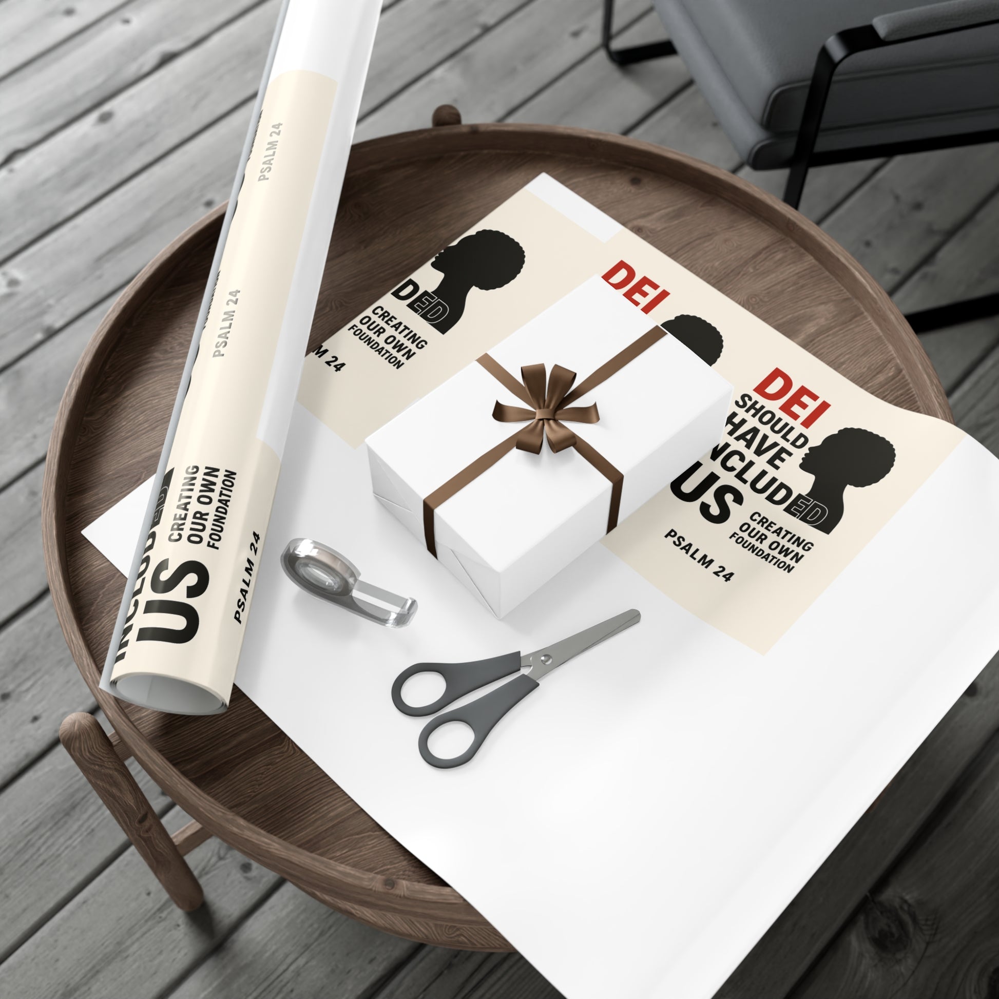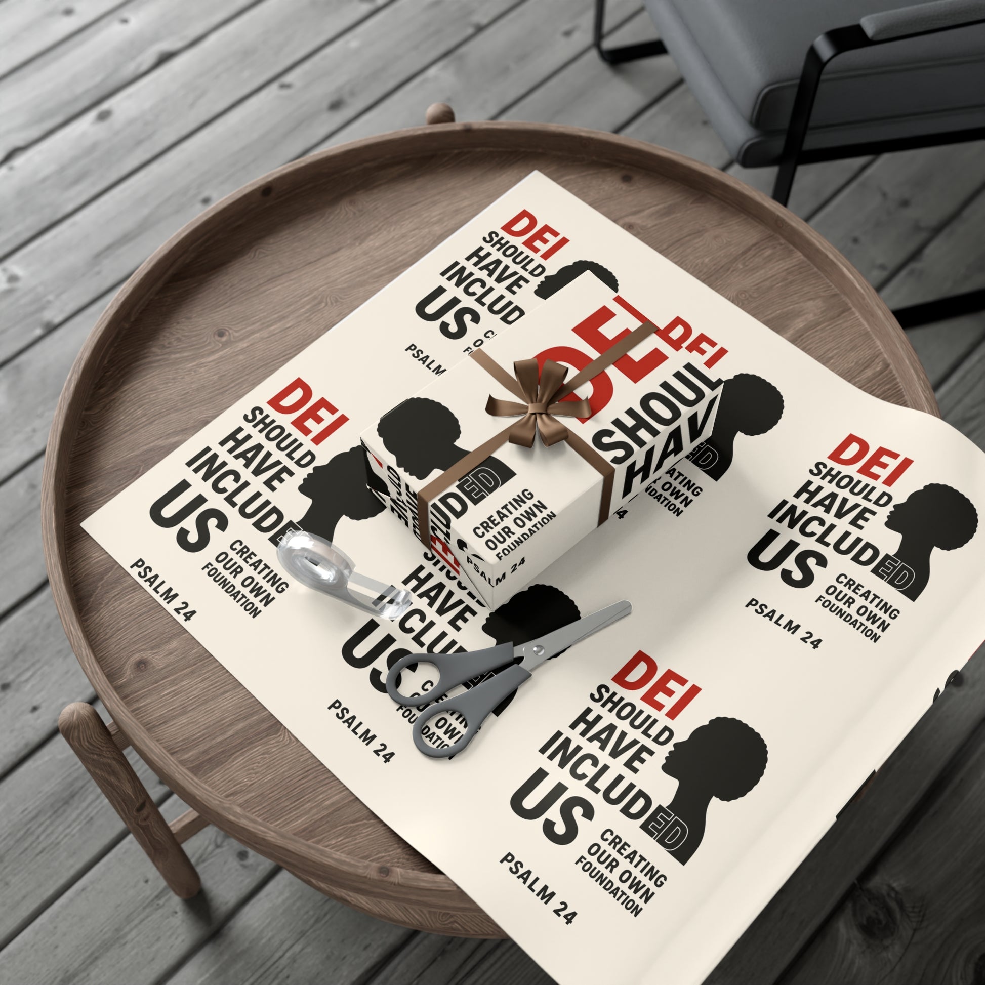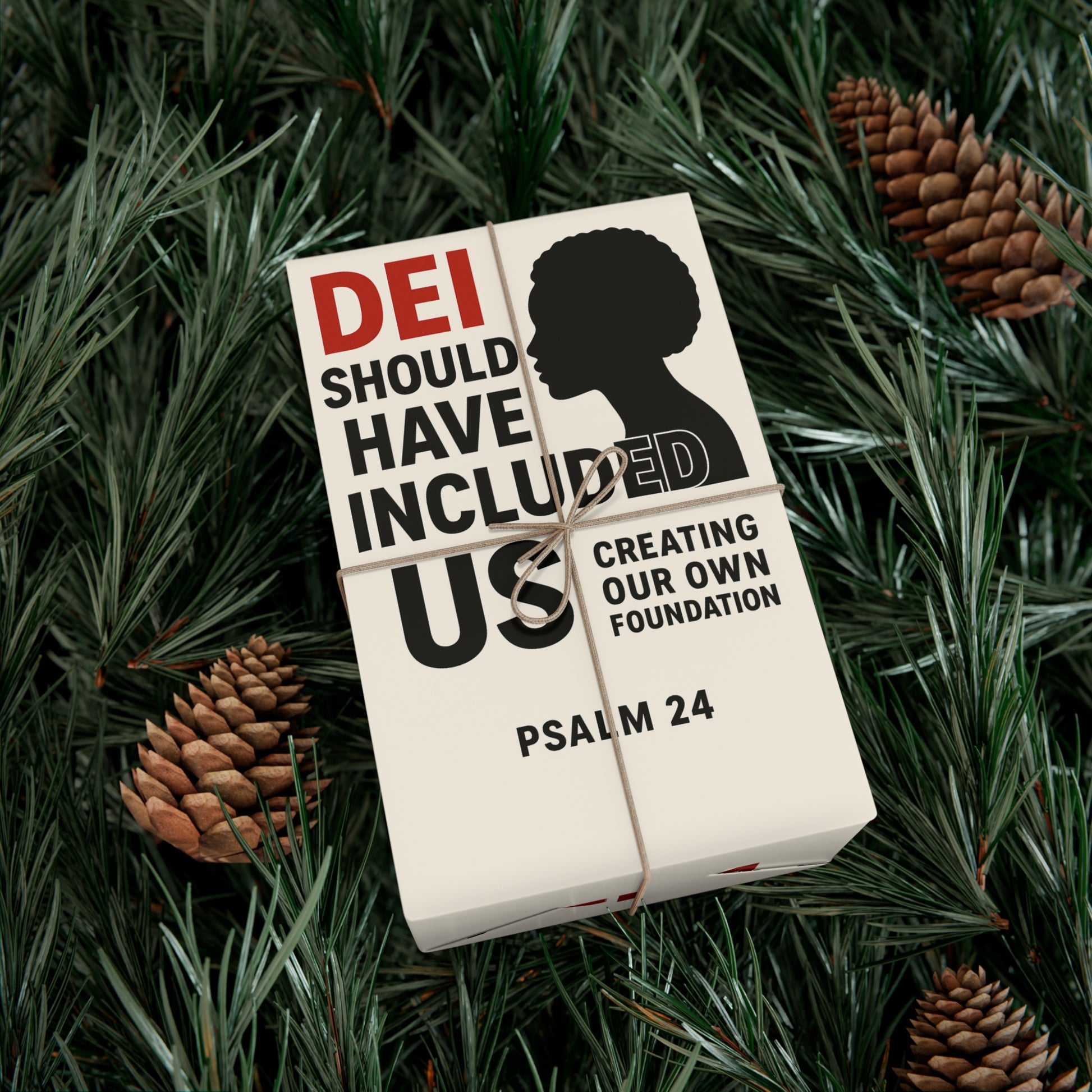 DEI Gift wrap " DEI Should Have Included Me" for the holiday - Gift Wrapping. Available in two paper finishes (satin, matte), this wrap lets you choose what best fits your audience's needs. Each sheet is printed using GreenGuard UL Certified inks and the blank paper is made in the USA under strict quality control. Material: 100% paper. Two paper finishes (Matte, Satin). Three sizes to choose from. Printed using GreenGuard UL Certified inks. Scratch and water resistant. Flexible and durable material. Resists cracking when folded or creased. Assembled in the USA from globally sourced parts.