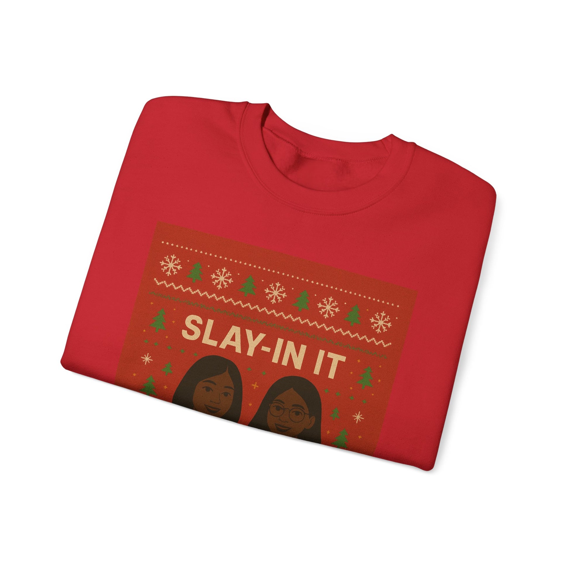 This cozy crewneck brings holiday warmth and playful sass to casual winter days. Soft, medium‑heavy fleece drapes in a relaxed, classic fit while a bold seasonal print on the chest showcases diverse, confident faces framed by festive motifs and the cheeky headline “SLAY‑IN IT.” Wear it to low‑key gatherings, tree‑lighting nights, or while wrapping gifts at home — it reads as both comfy loungewear and a statement piece that celebrates community and joy. The neutral sweatshirt color lets the red and green artwork pop, while durable double‑needle stitching and a ribbed collar keep the shape through repeated wear. Lightweight enough for layering, yet substantial enough to feel like a warm hug on chilly evenings.